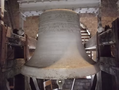 Links ist die Glocke 1 zu sehen, es ist die große Glocke. Oben umlaufend steht der